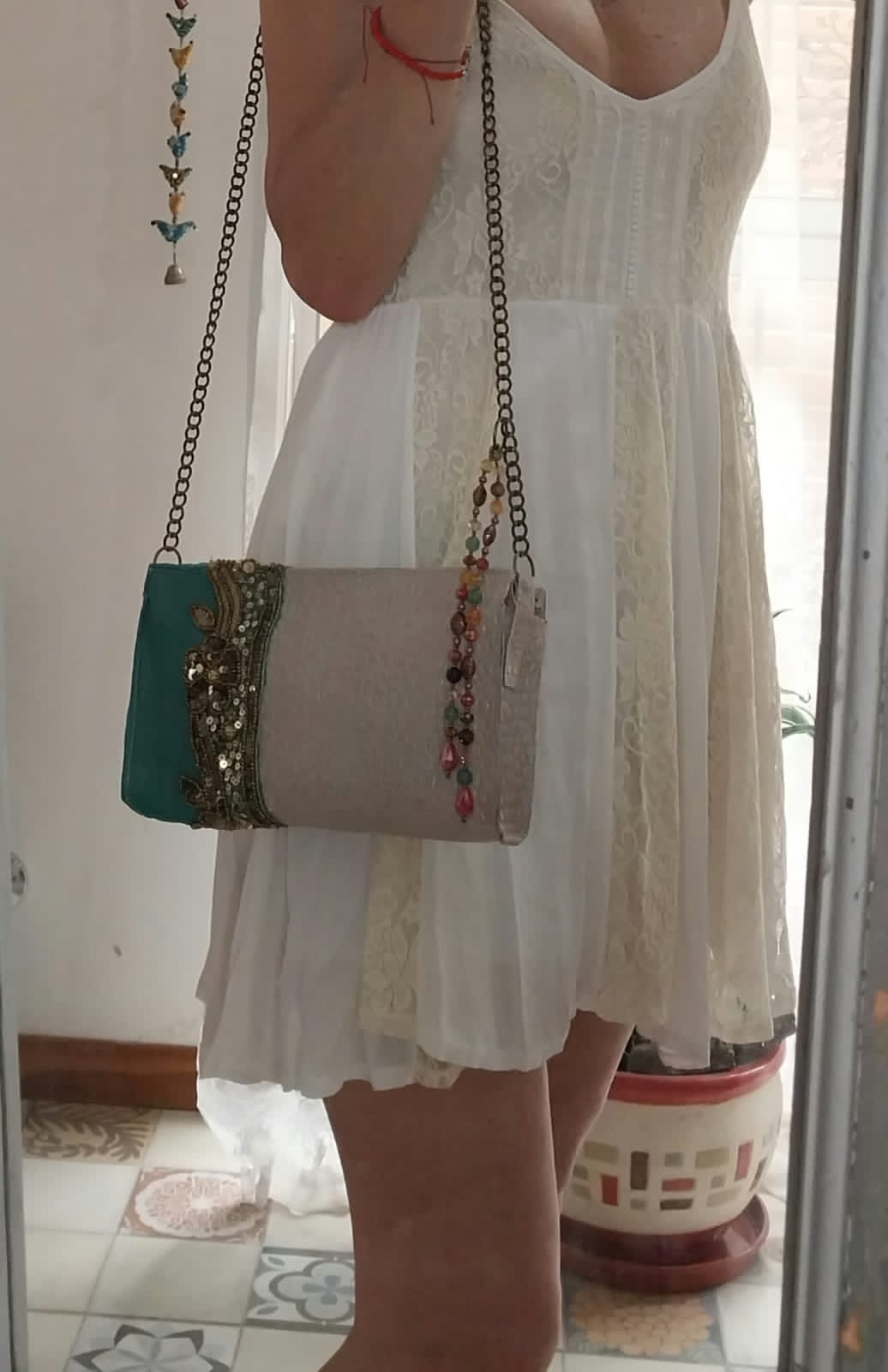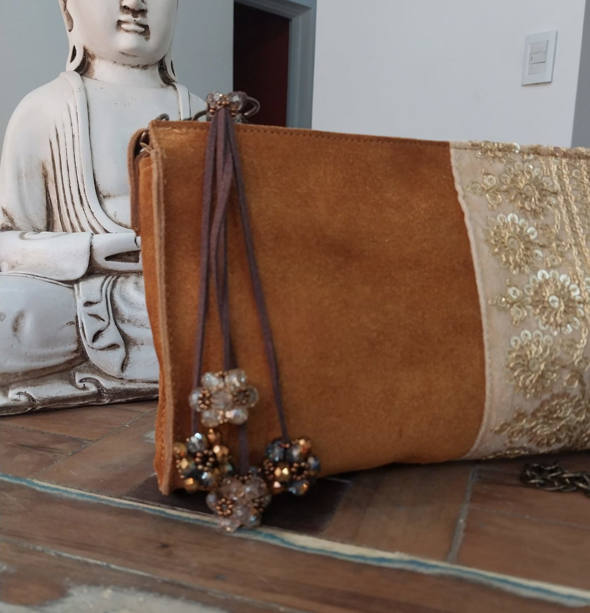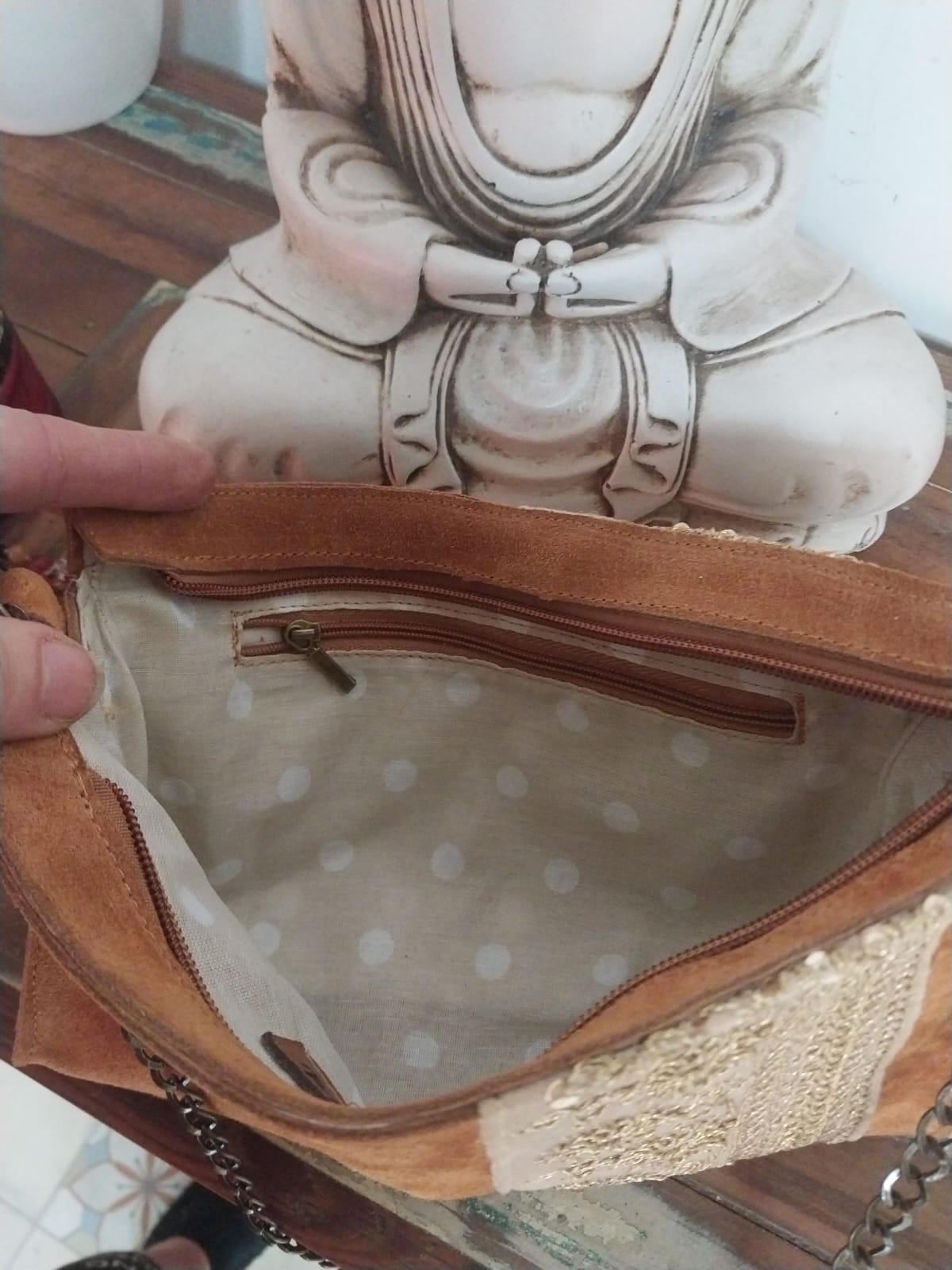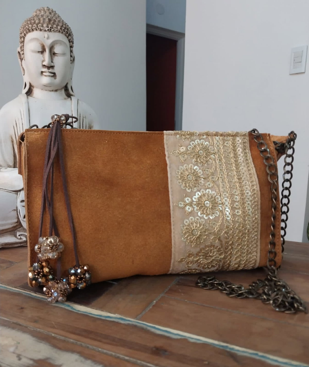 Es una bandolera de gamuza vacuna con detalle de galón de la India. Está forrada por dentro, tiene bolsillo interno con cierre y tira de cadena.