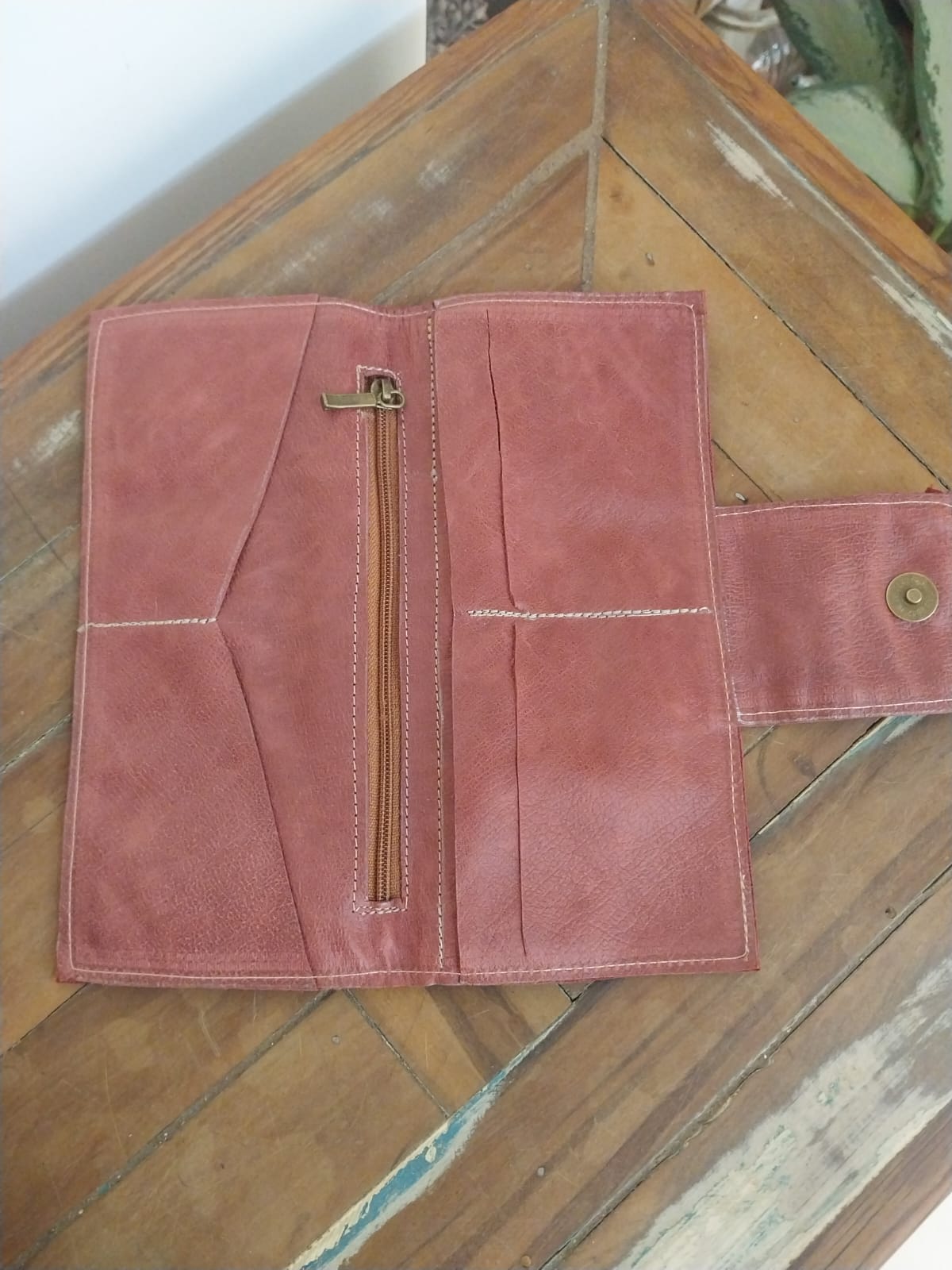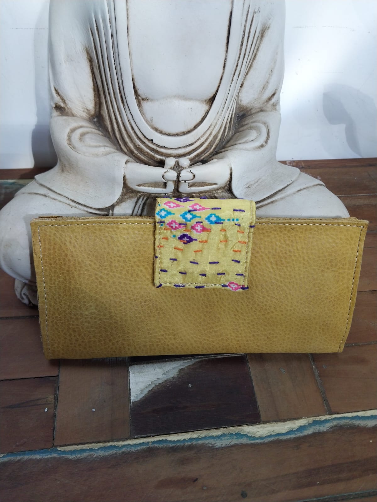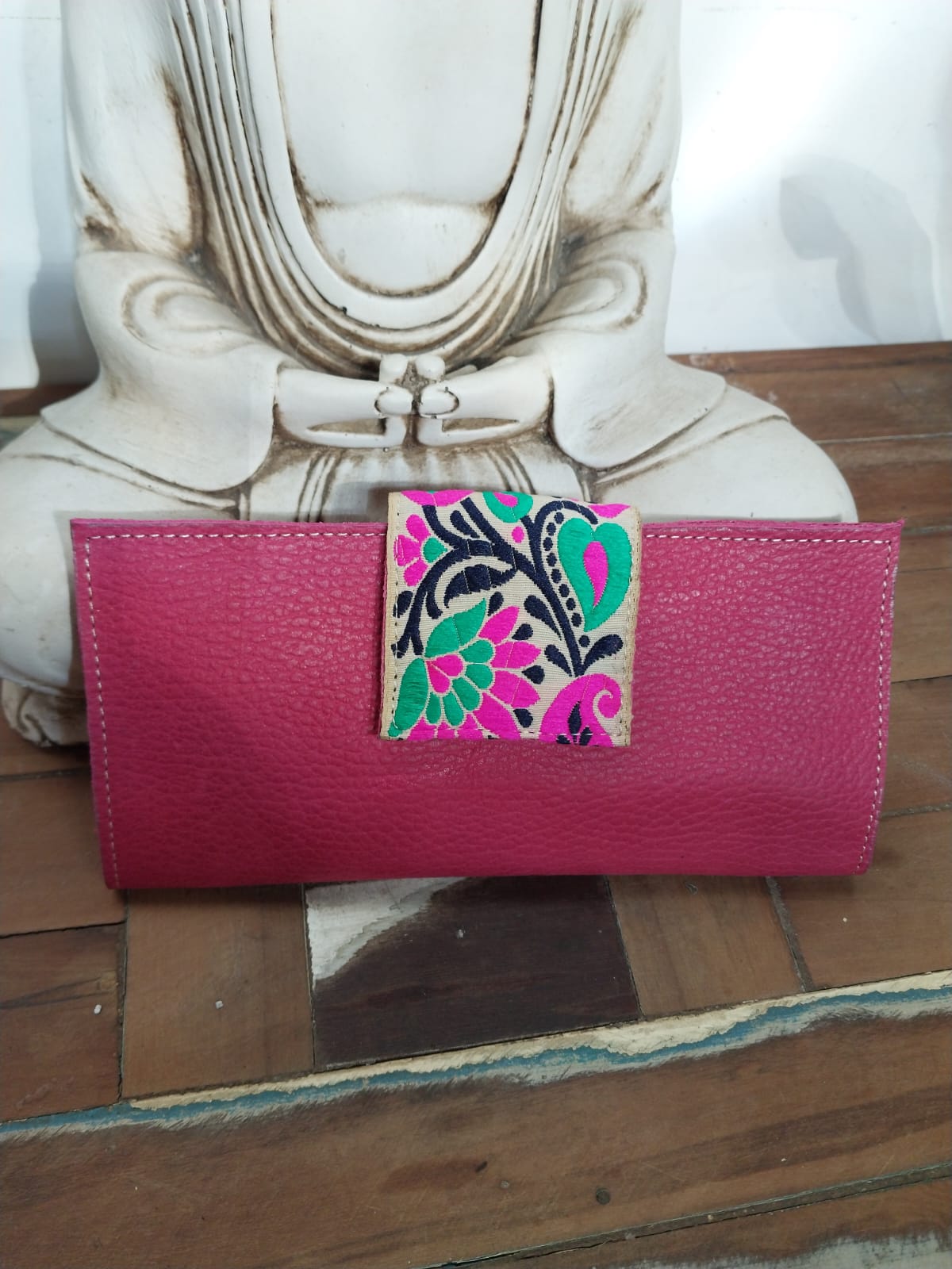 Las billeteras miden 20 x 9cm, son de cuero vacuno con detalles de tela y/o galón de la India.