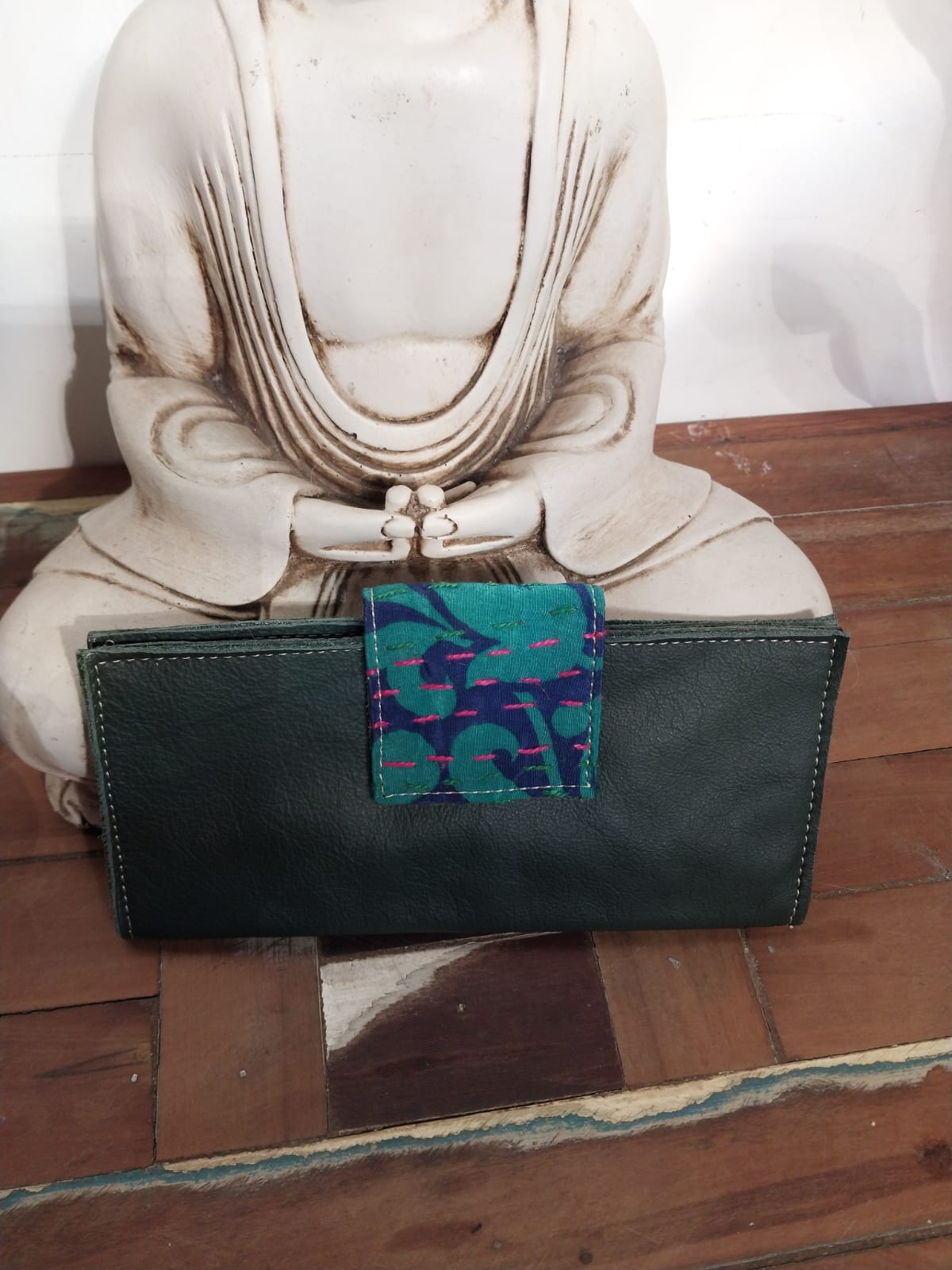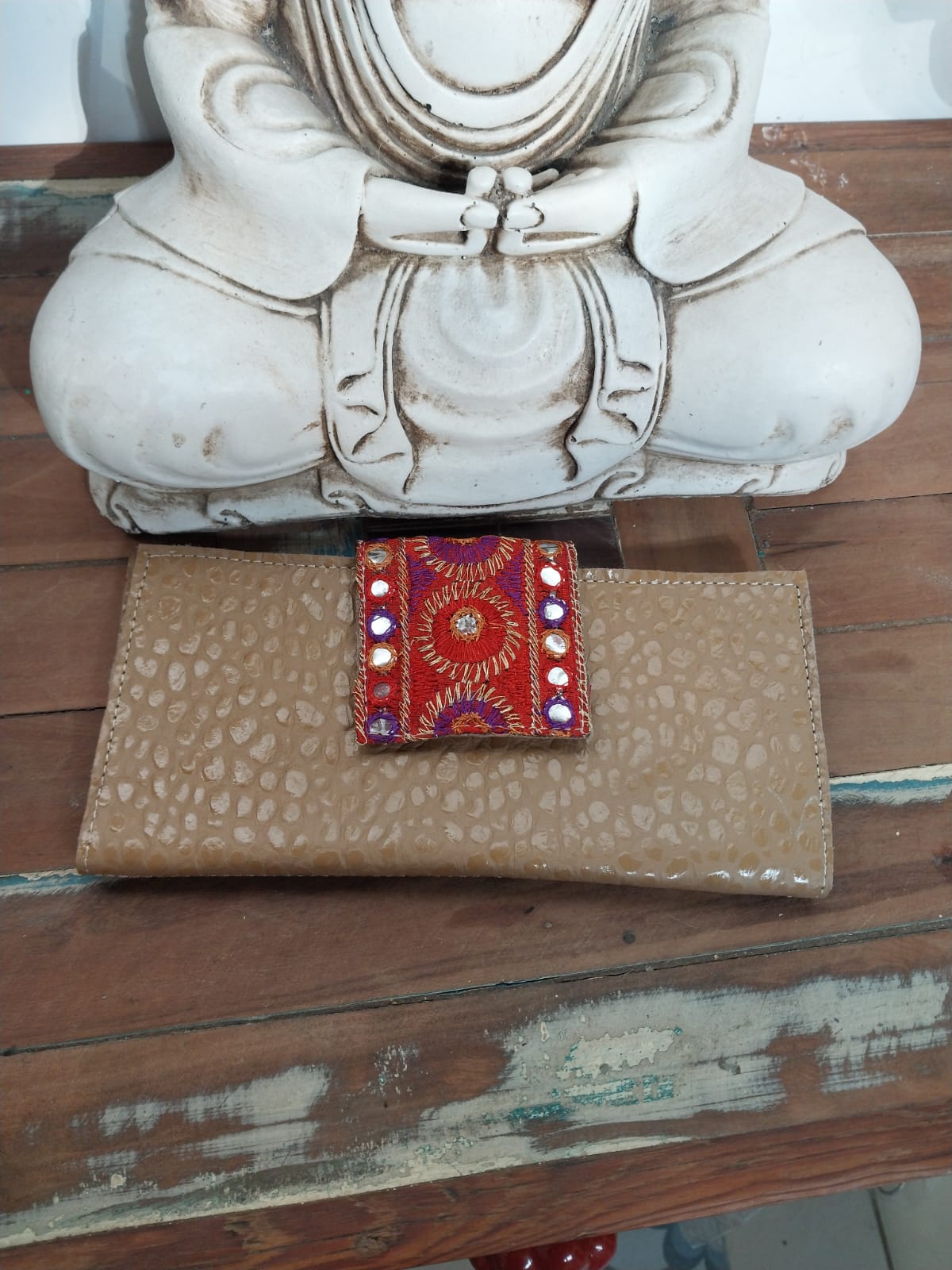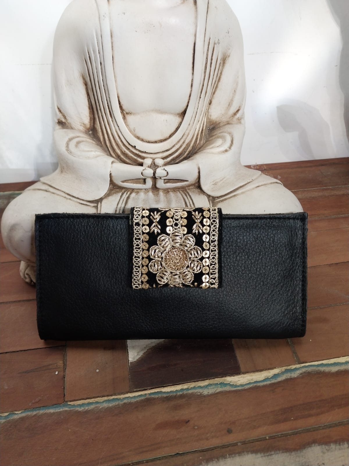 Las billeteras miden 20 x 9cm, son de cuero vacuno con detalles de tela y/o galón de la India.