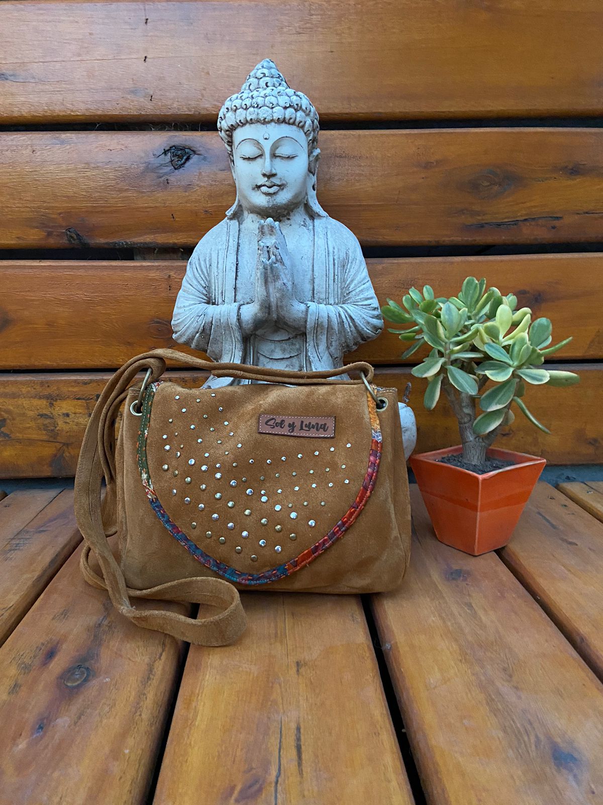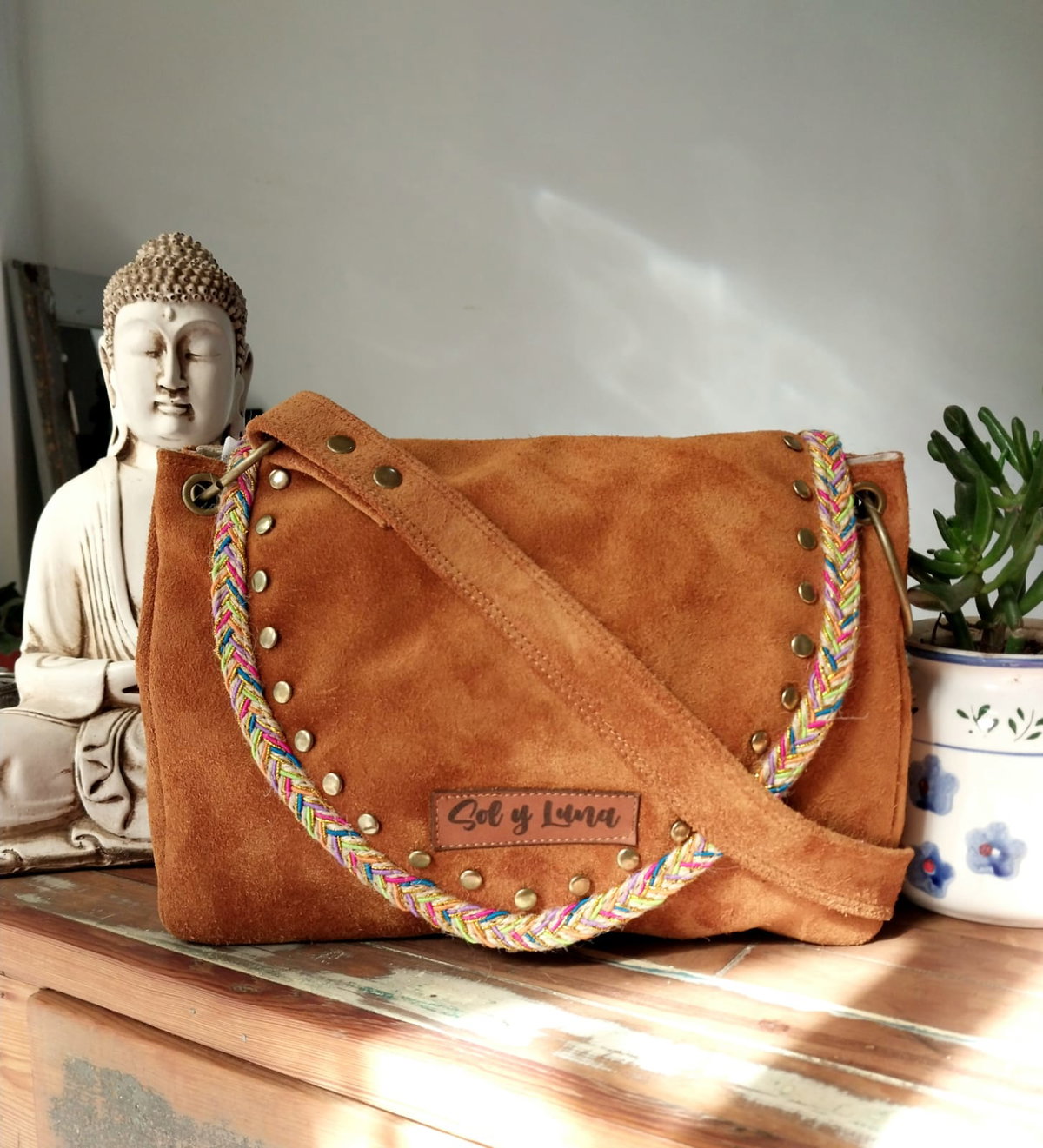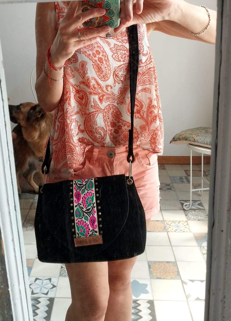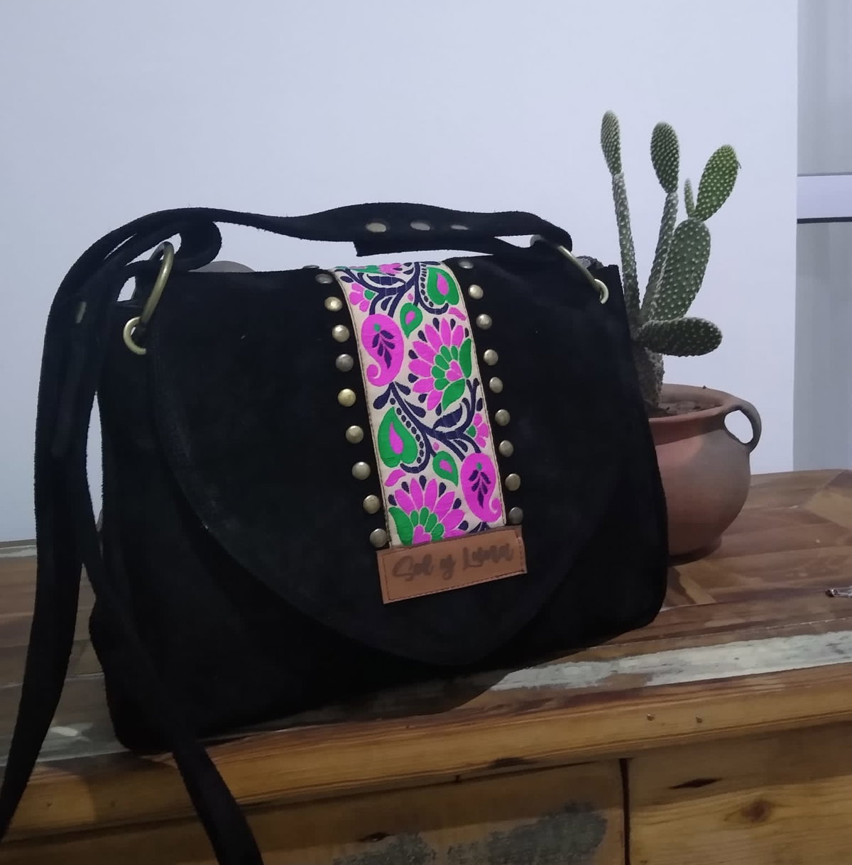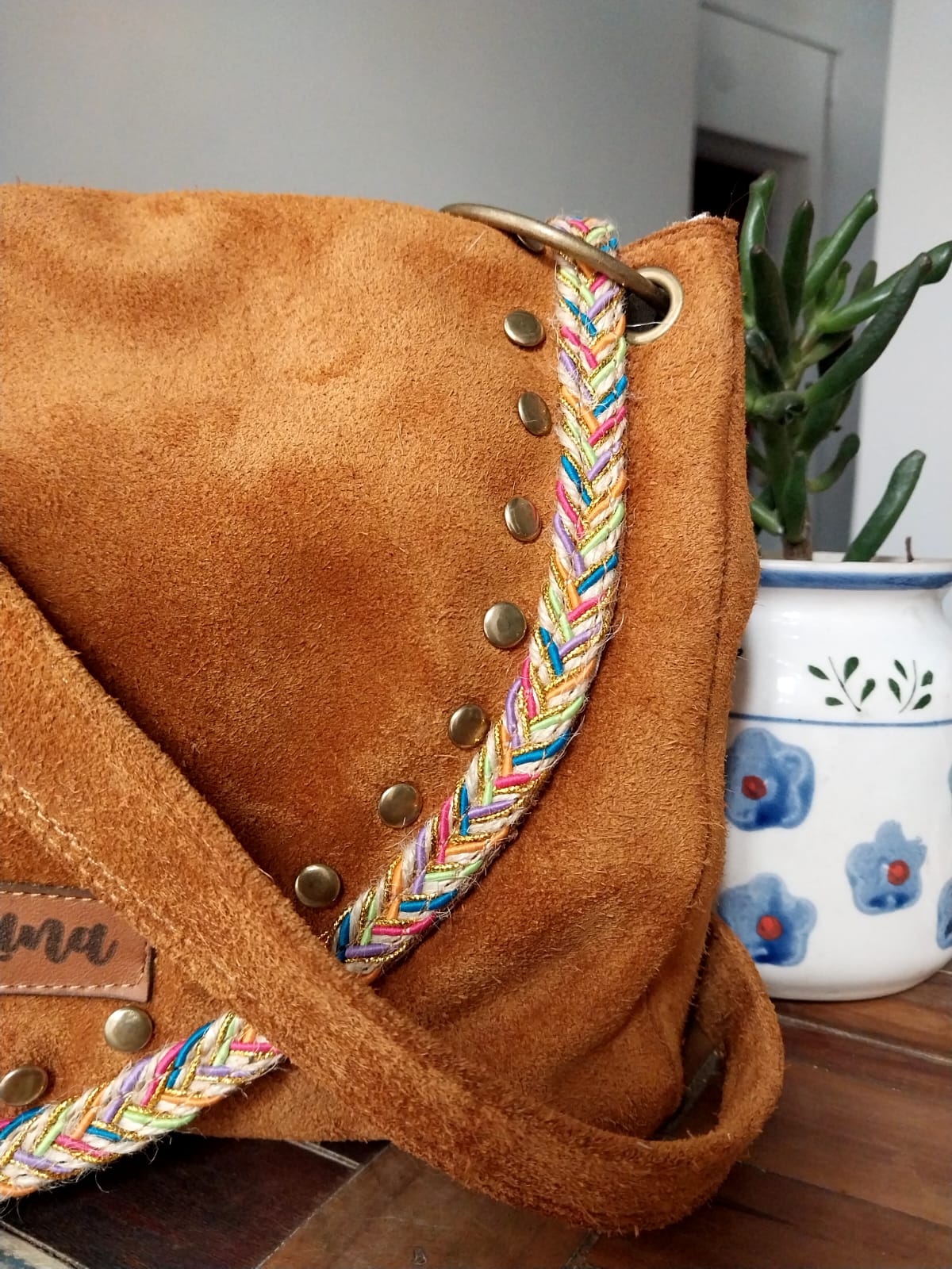El modelo está realizado en gamuza vacuna o cuero vacuno con detalle de galón o tela de la India al frente. Tiene un bolsillo interno y está forrada por dentro.