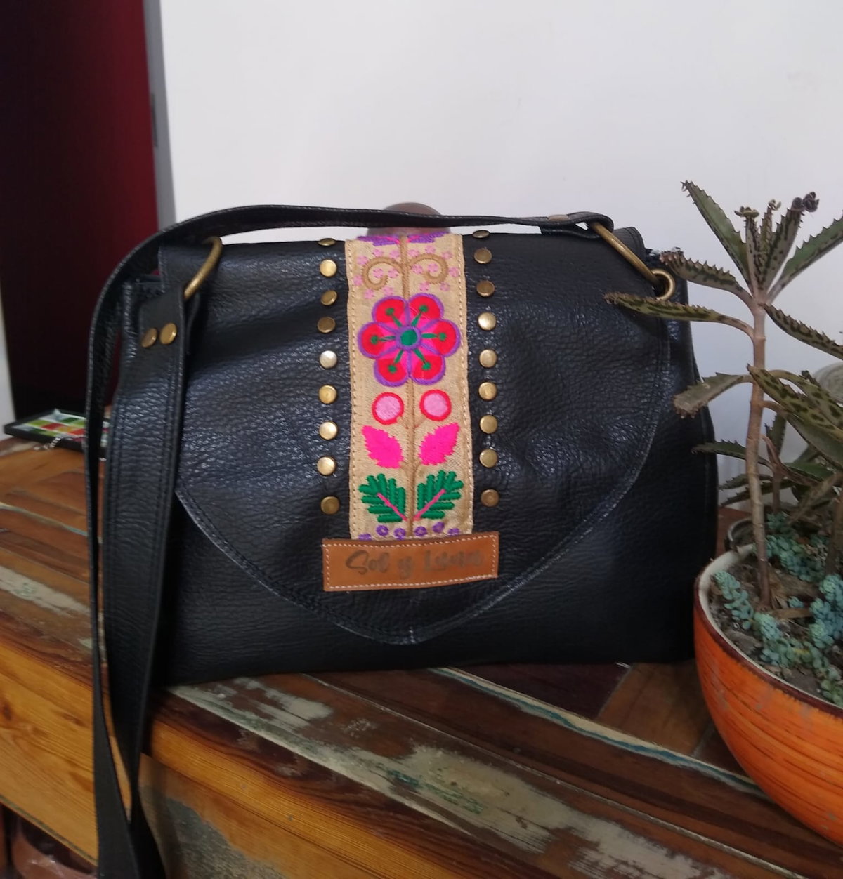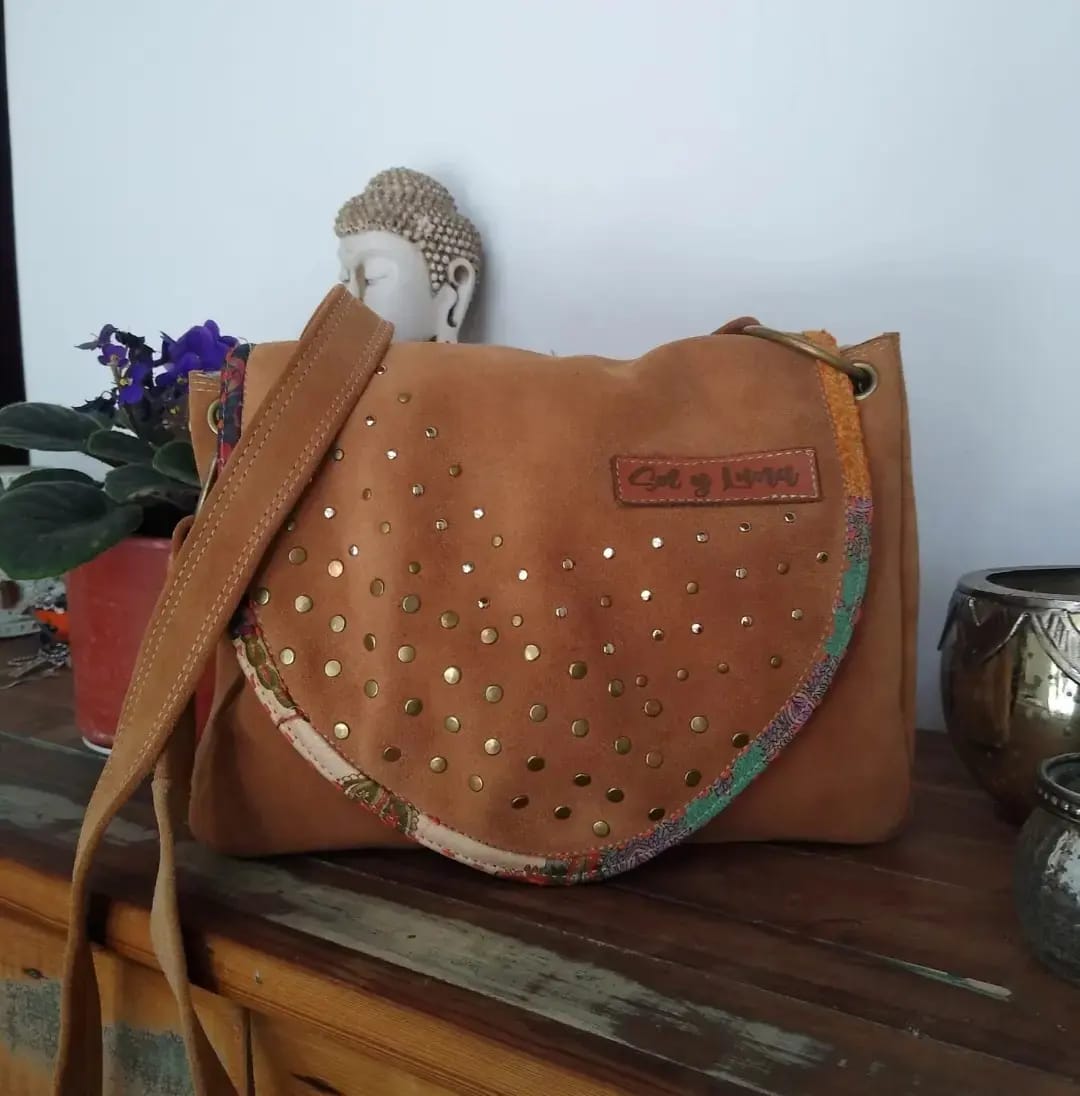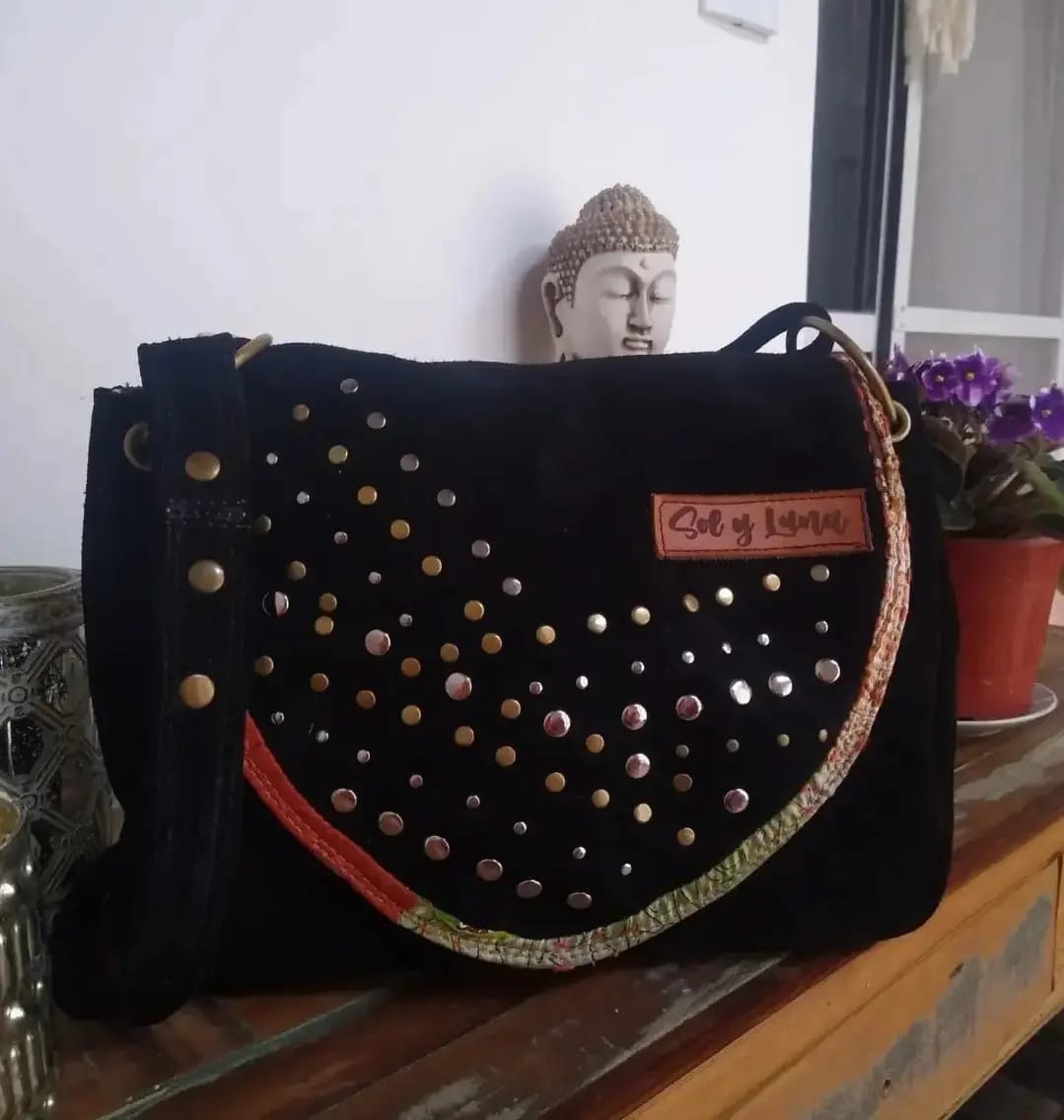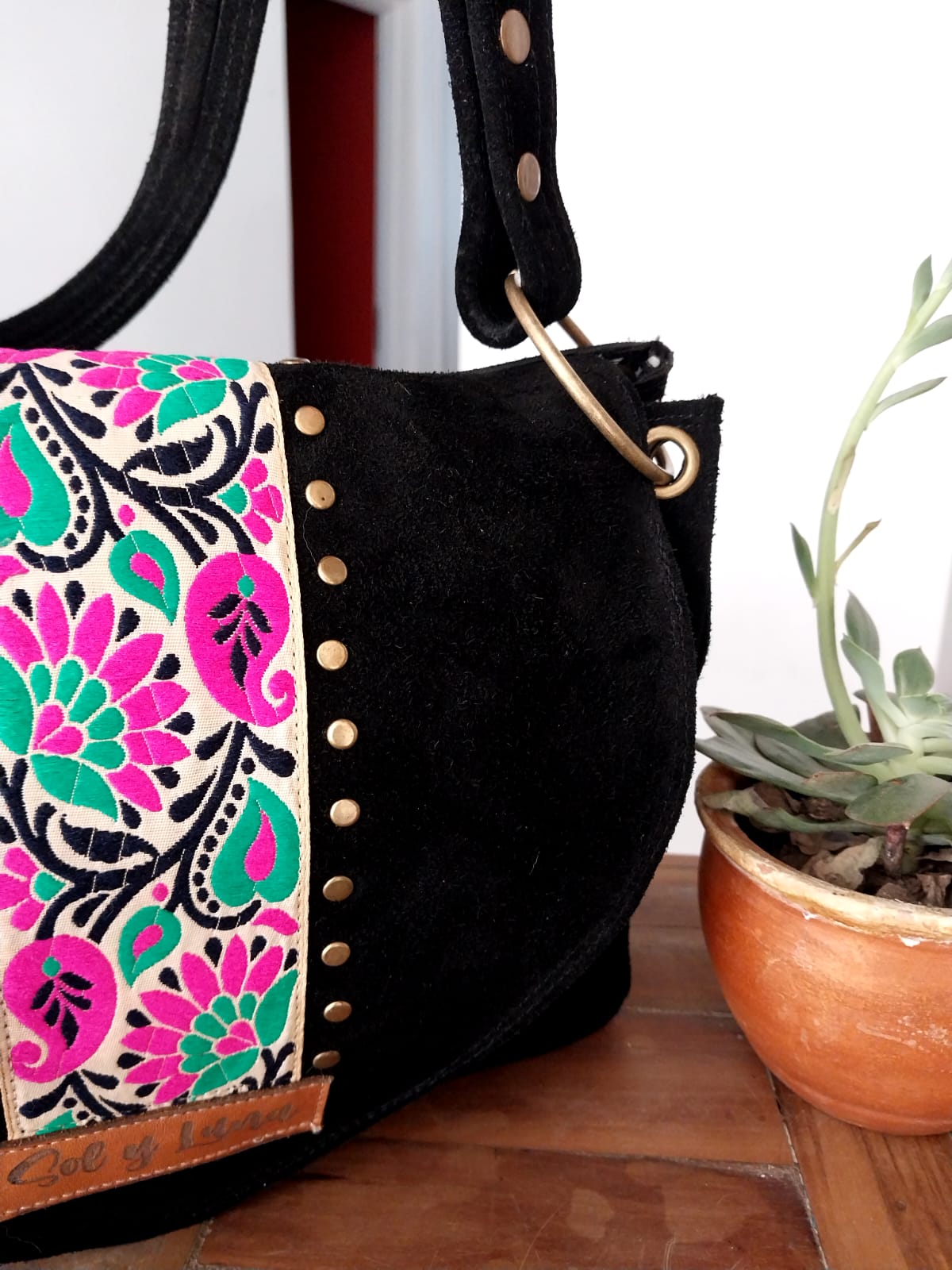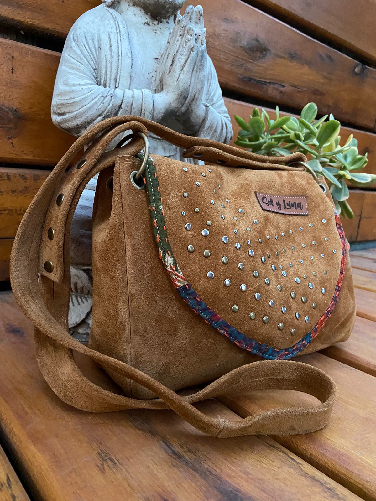 El modelo está realizado en gamuza vacuna o cuero vacuno con detalle de galón o tela de la India al frente. Tiene un bolsillo interno y está forrada por dentro.