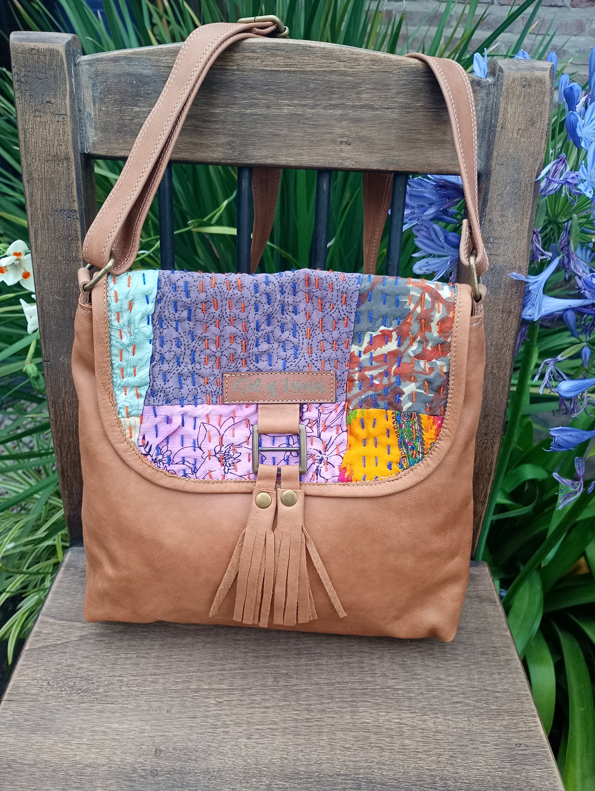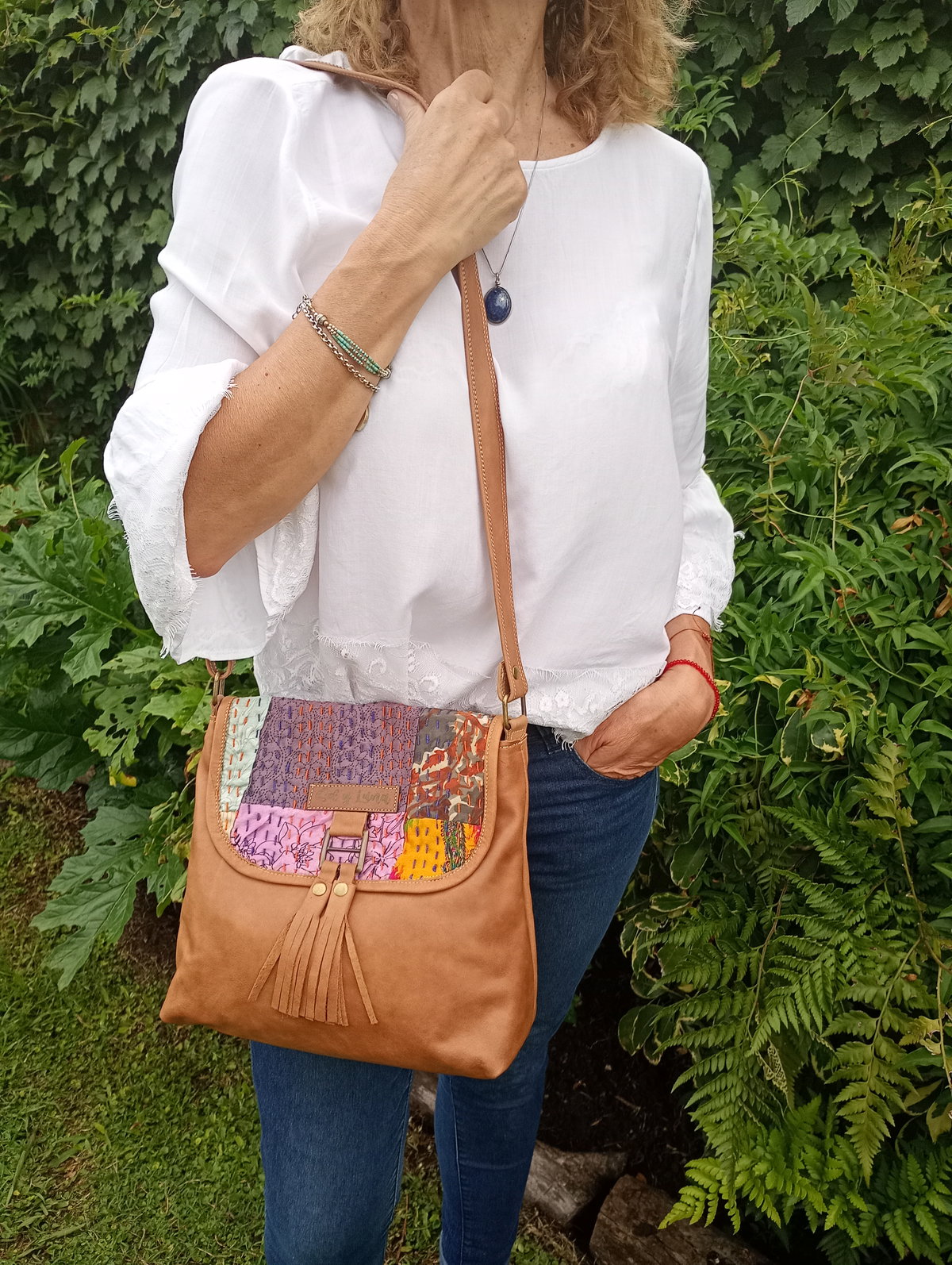 Realizada en cuero vacuno, tiene detalle de tela de la India en la tapa, con pompones a tono. ESMERALDA está forrada por dentro, tiene cierre superior, bolsillo interno con cierre y bolsillo portacelular. Además, la tira es de cuero y regulable para tu mayor comodidad.