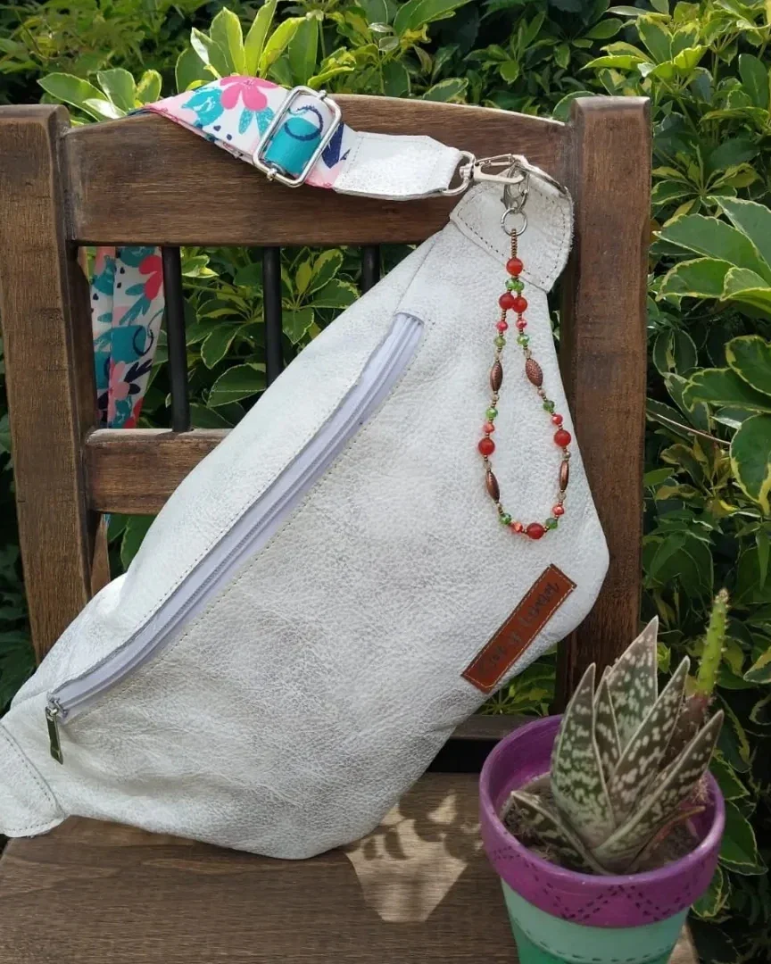 Maxi riñonera realizada en cuero vacuno, forrada por dentro. Tiene un bolsillo externo trasero y amplia capacidad para guardar todo lo que quieras. Viene con cinta sublimada a tono, desmontable y regulable. Además, incluye un accesorio realizado con cristales y piedras, que podés usar como llavero.