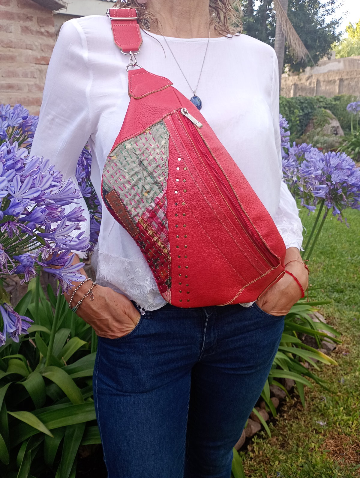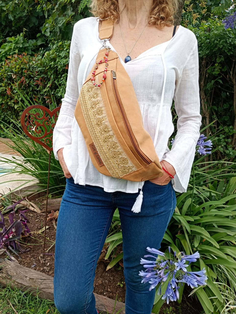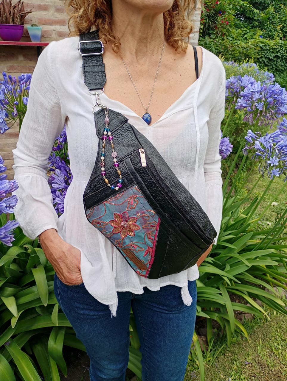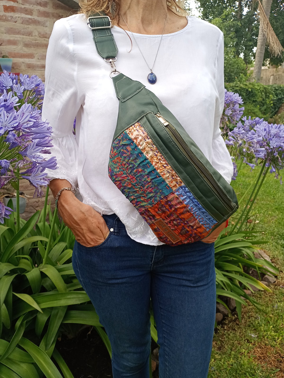 Maxi riñonera realizada en cuero vacuno, forrada por dentro. Tiene un bolsillo externo trasero, amplia capacidad para guardar todo lo que quieras. Además, en el frente tiene otro bolsillo externo, con detalles de tela de la India. Viene con correa de cuero a tono desmontable y regulable.