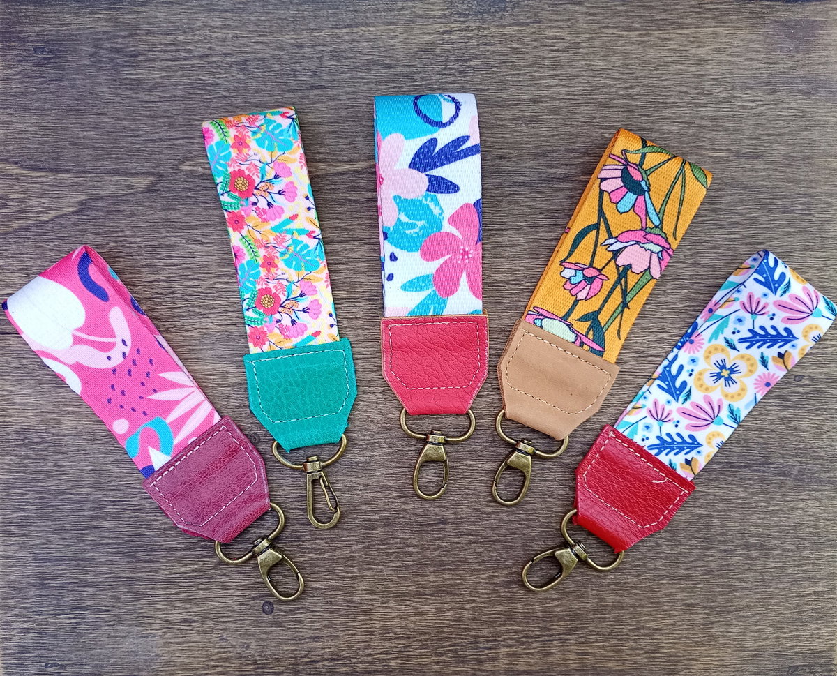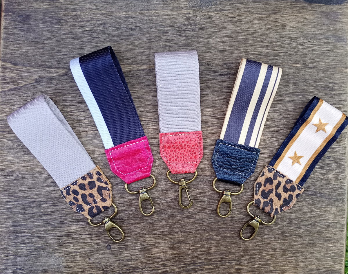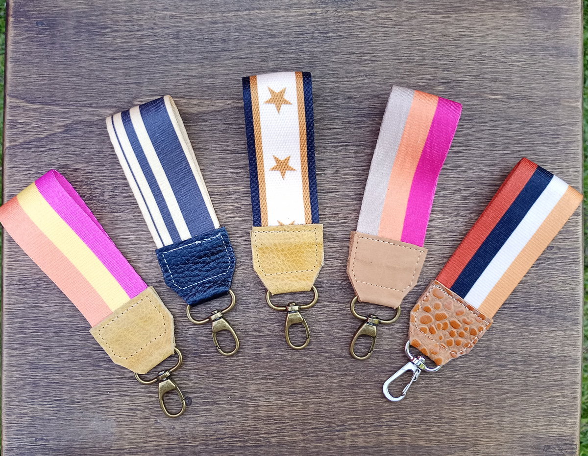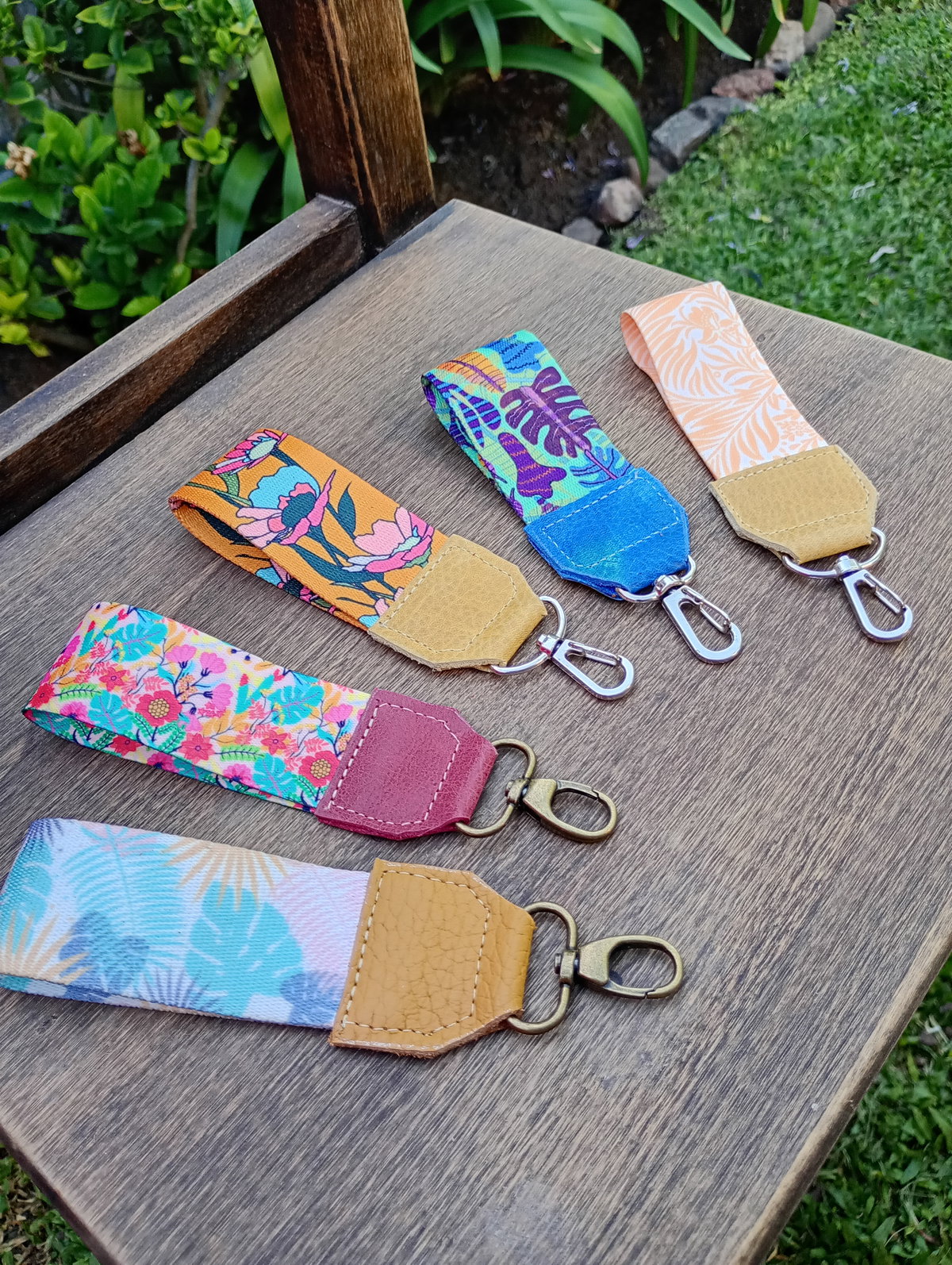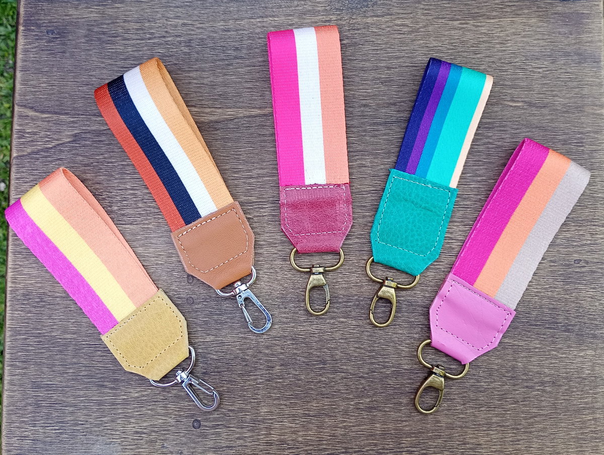 Llaveros que combinan cintas sublimadas con cuero vacuno.Terminación con mosquetón, el cual puede ser color niquel o bronce, según stock.