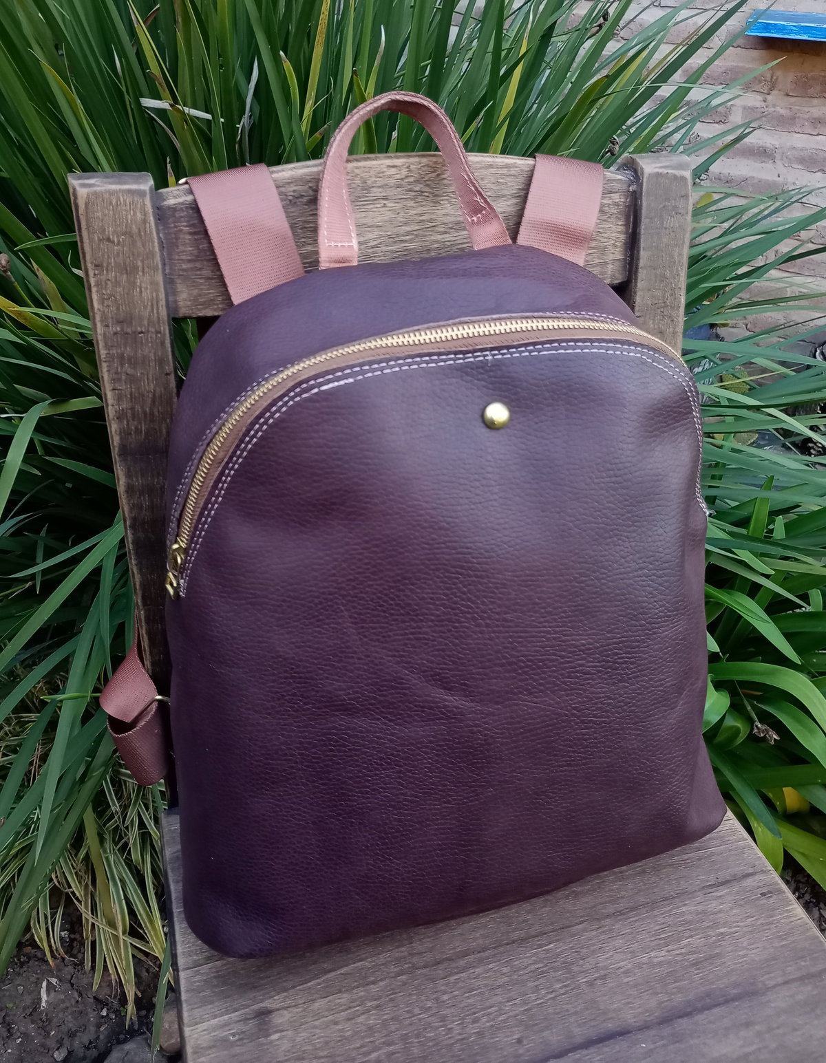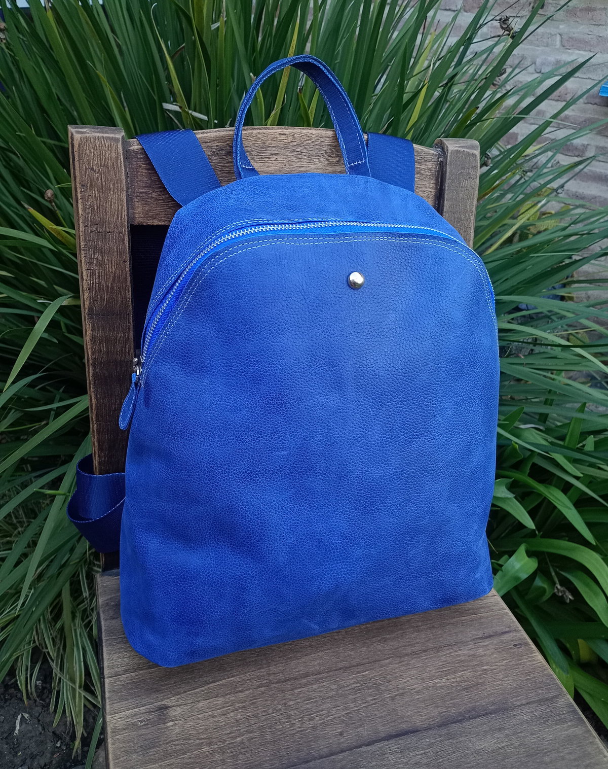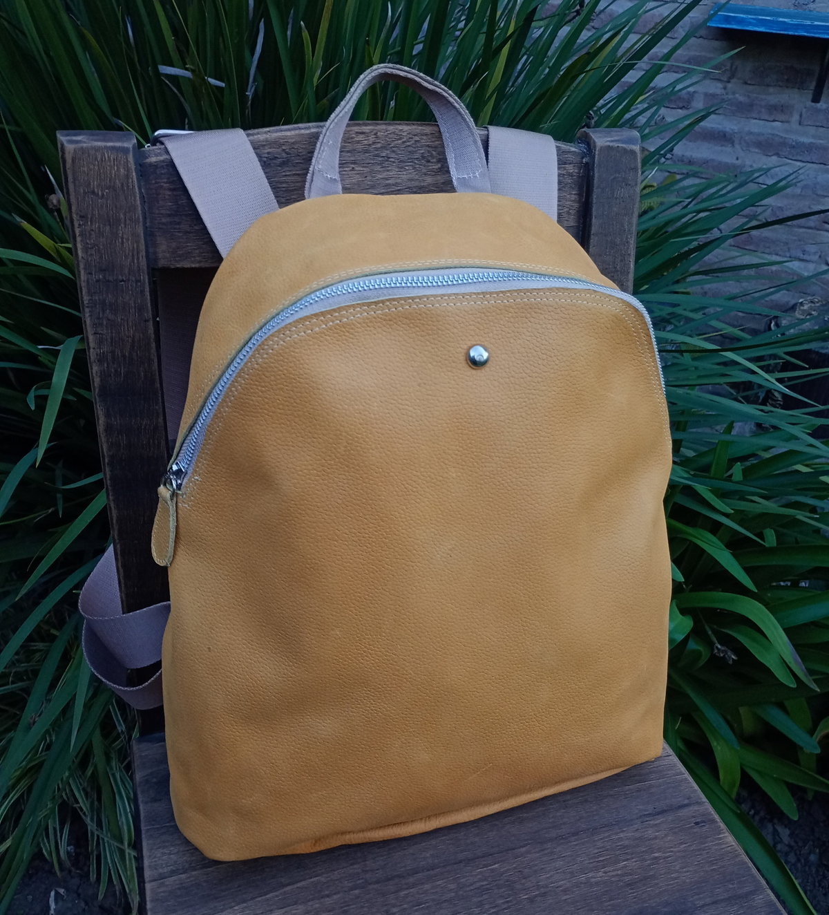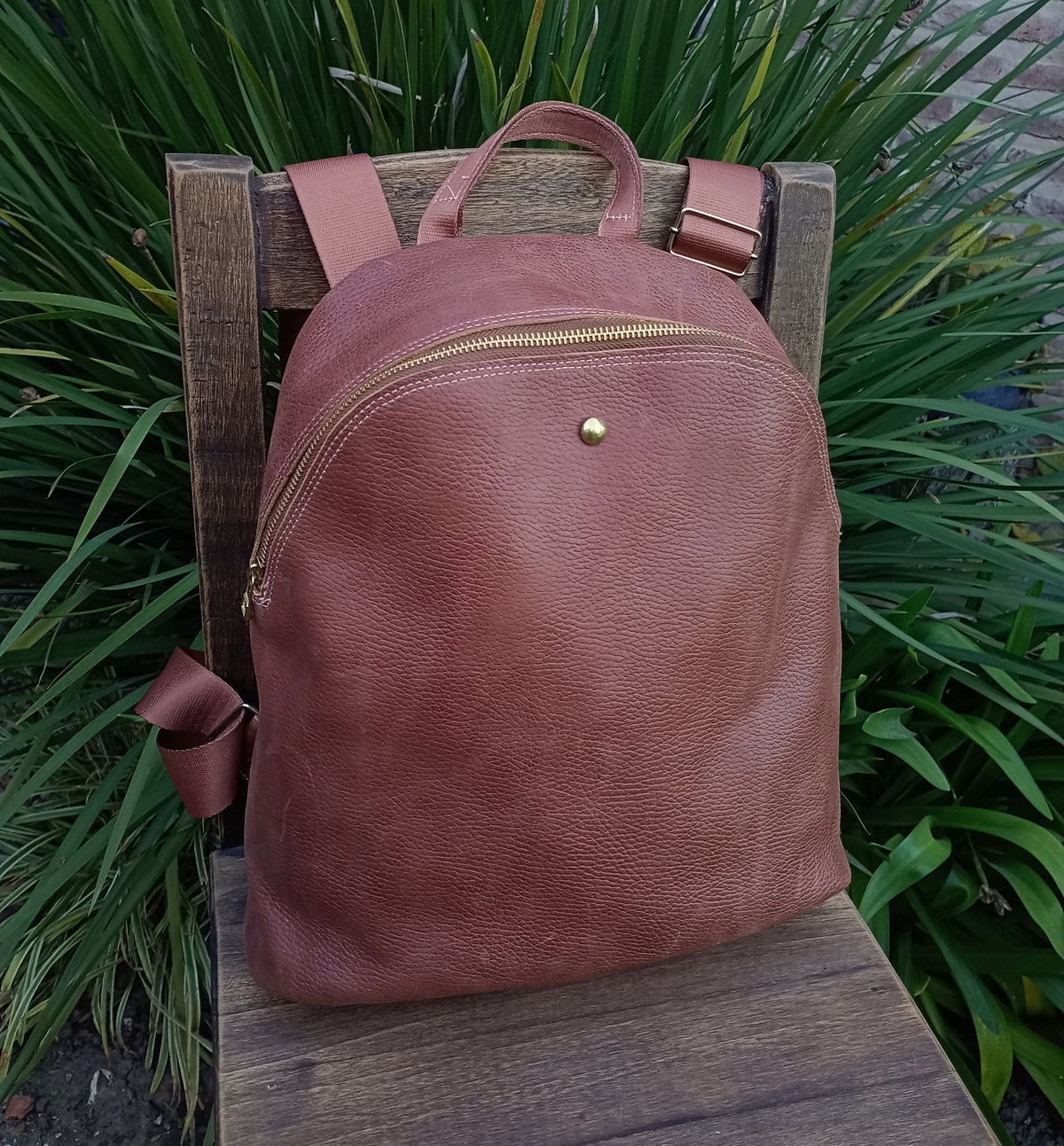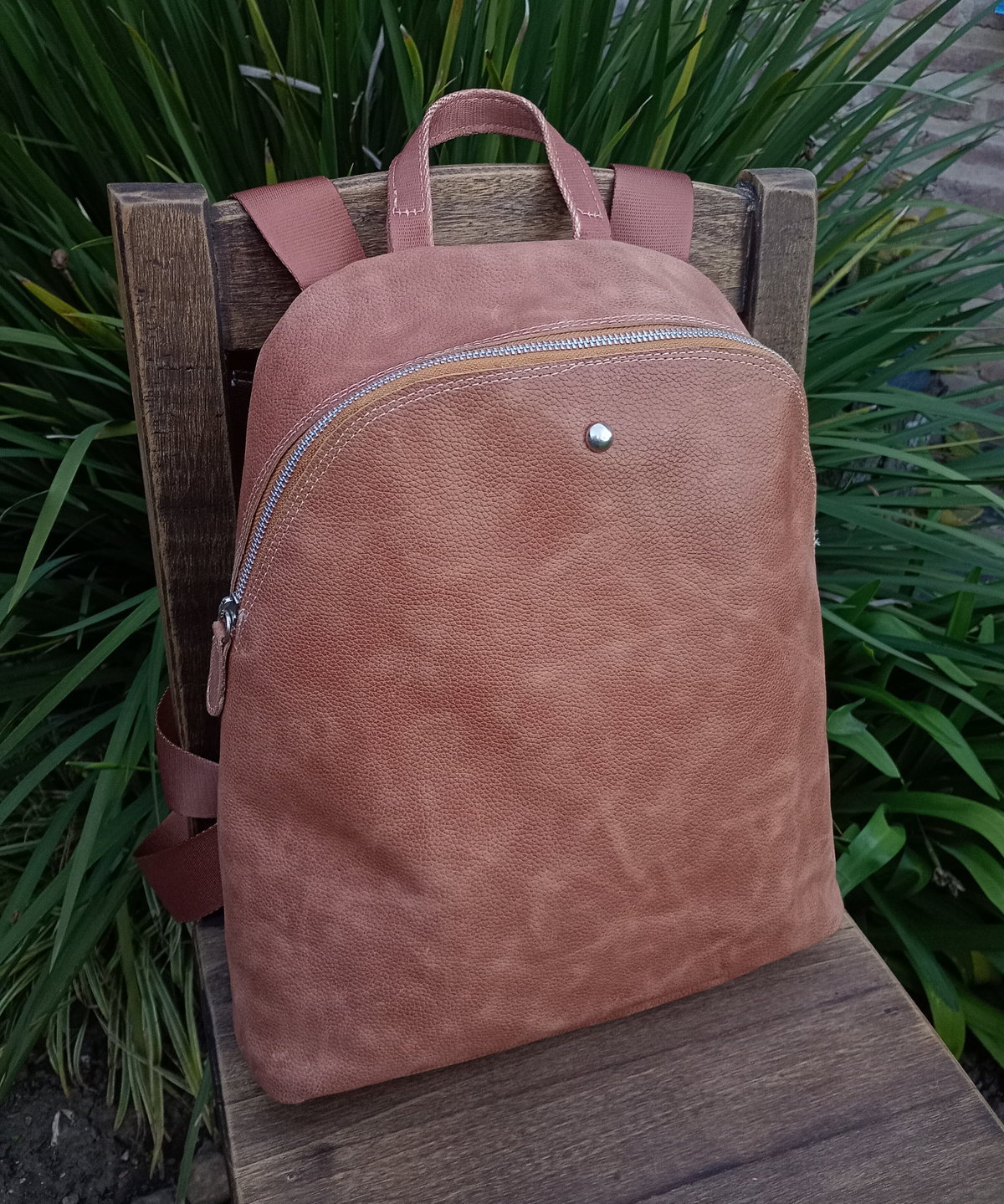 Mochila realizada en cuero vacuno con cierre metálico a tono. Tiene tiras sublimadas regulables y cierre trasero. Tiene una amplia capacidad, está forrada y tiene bolsillo interno. Las medidas son: alto 36cm, ancho 30cm en su base. El fuelle (profundidad) es de 6 cm.