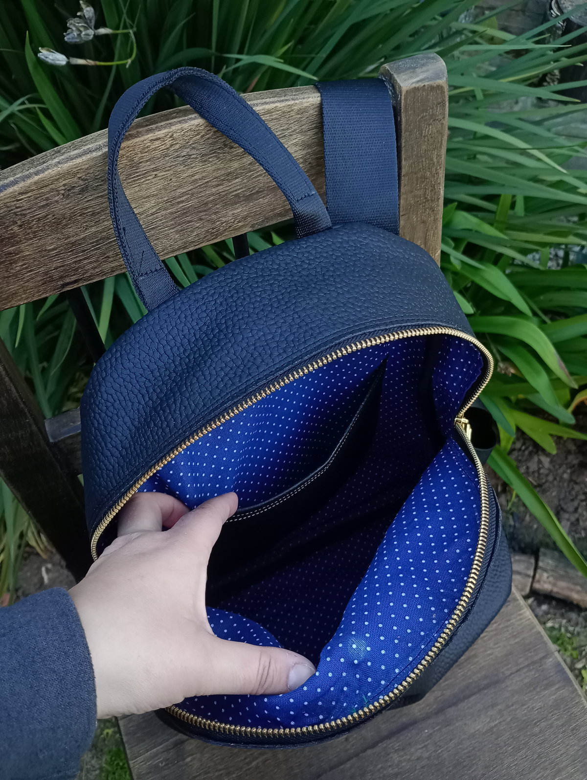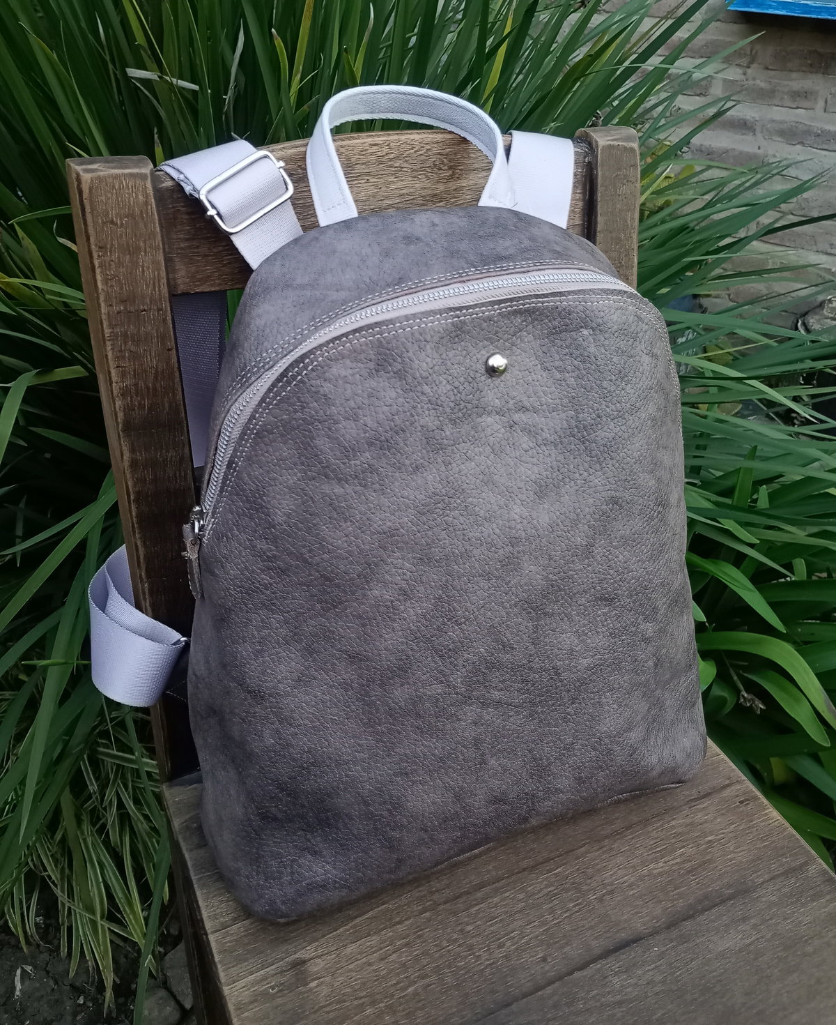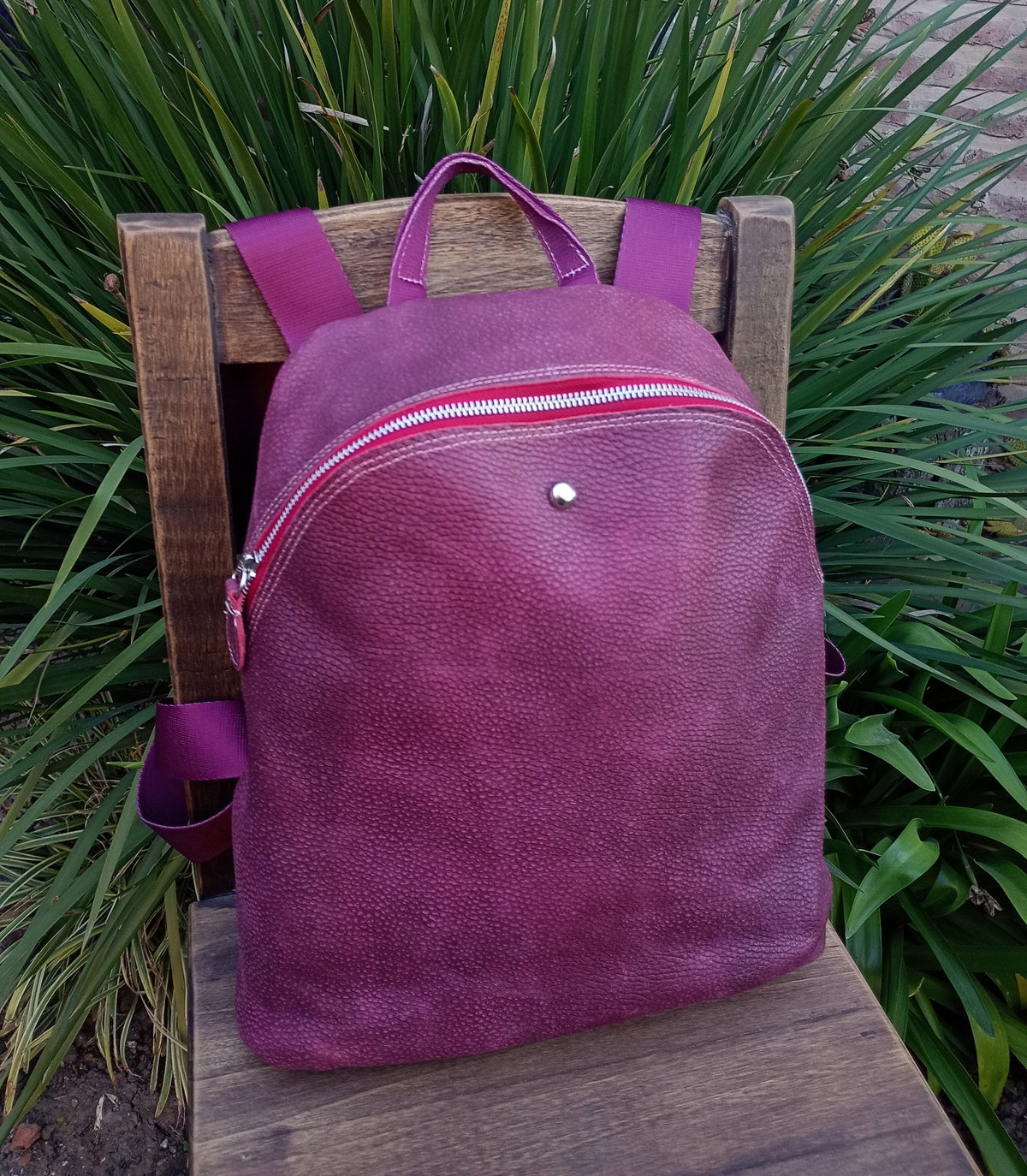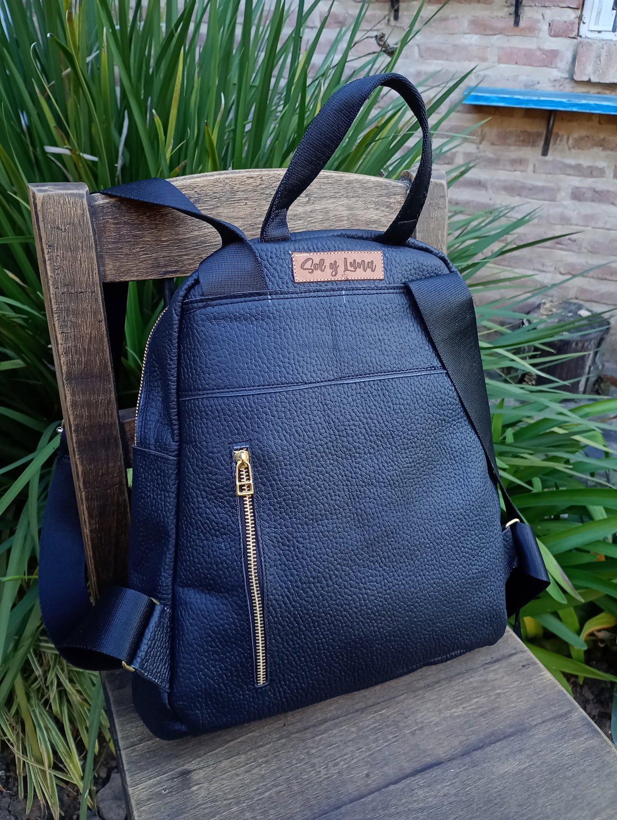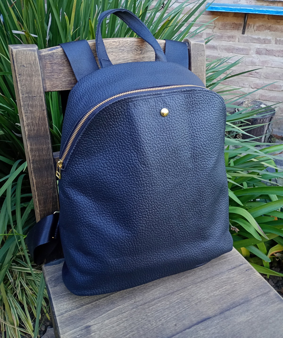 Mochila realizada en cuero vacuno con cierre metálico a tono. Tiene tiras sublimadas regulables y cierre trasero. Tiene una amplia capacidad, está forrada y tiene bolsillo interno. Las medidas son: alto 36cm, ancho 30cm en su base. El fuelle (profundidad) es de 6 cm.