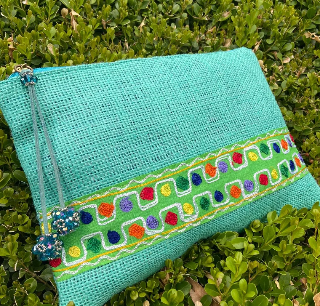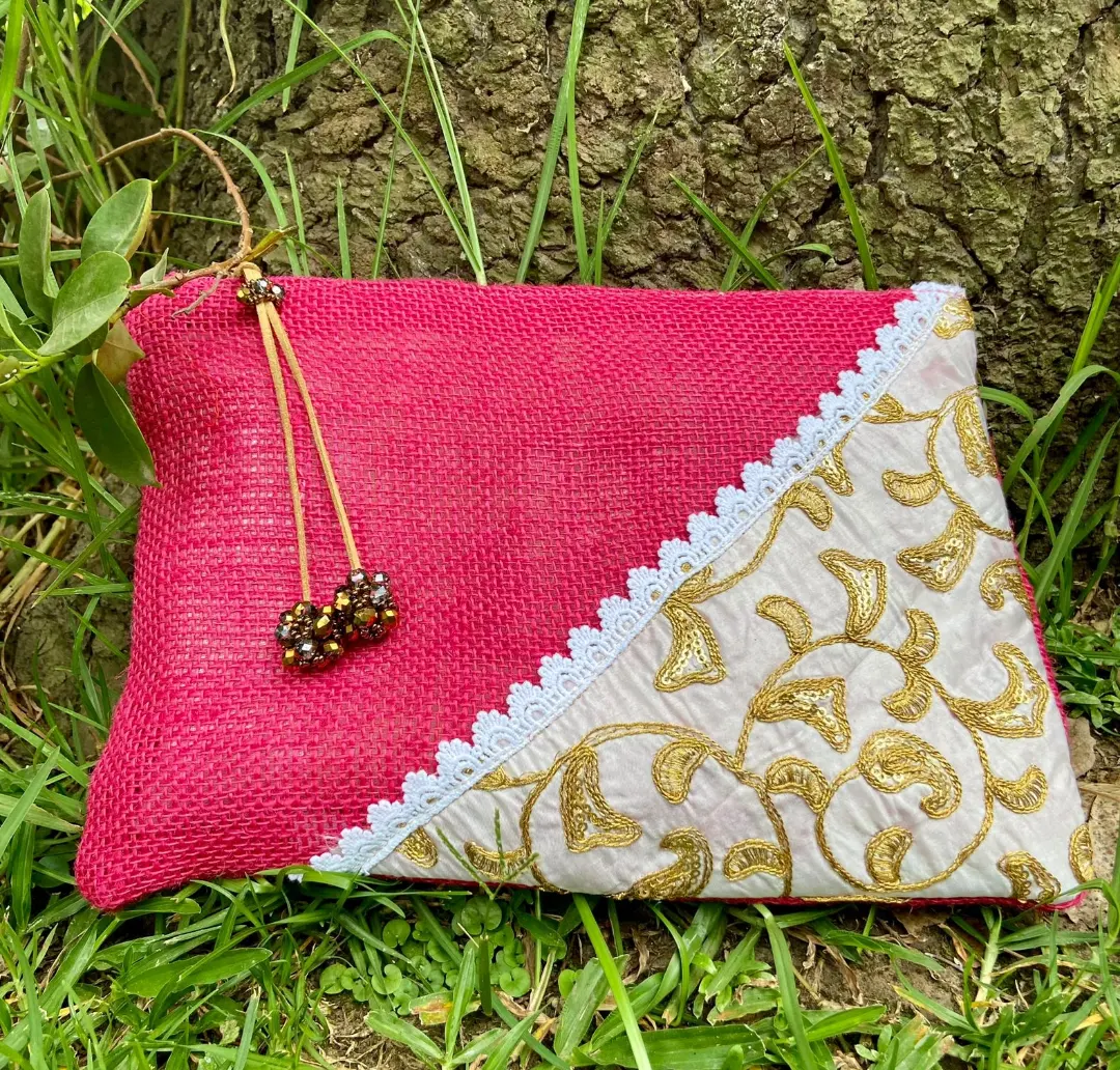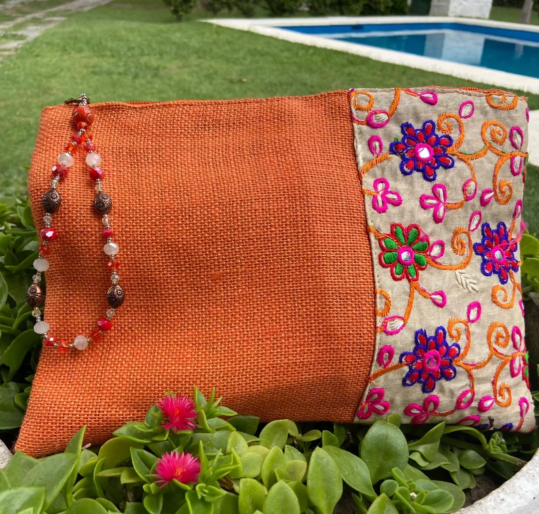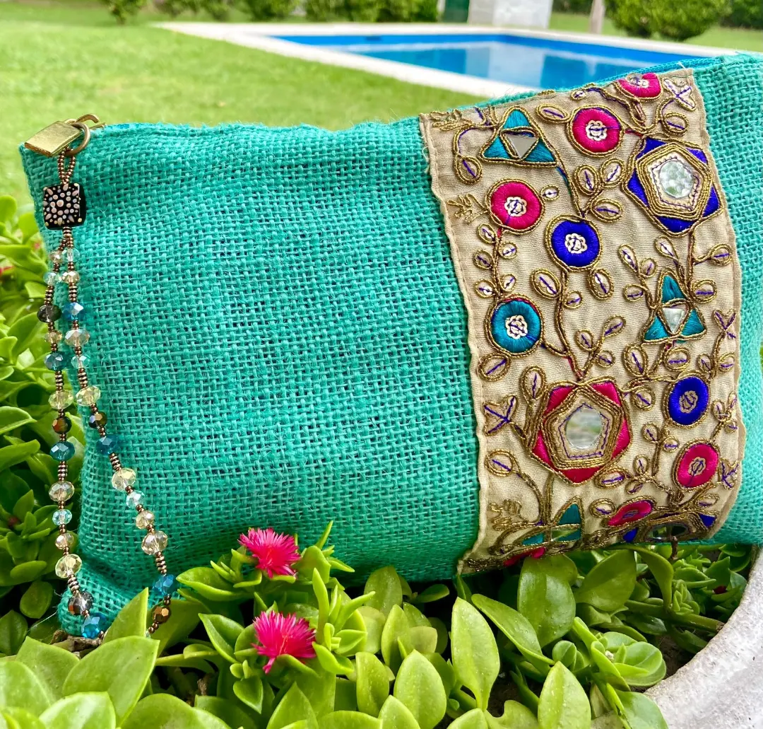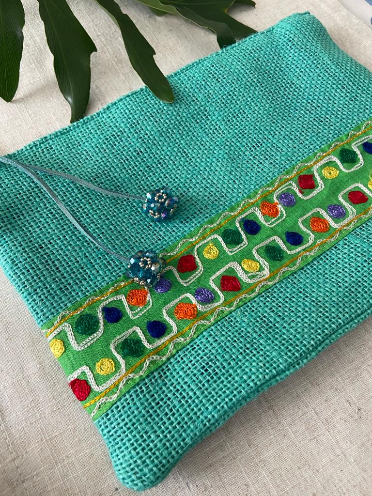 Los sobres realizados en arpillera de distintos colores combinados con galones y telas de la.India. Están forrados por dentro, tienen cierre superior y detalles realizados en cristales y piedras a tono.