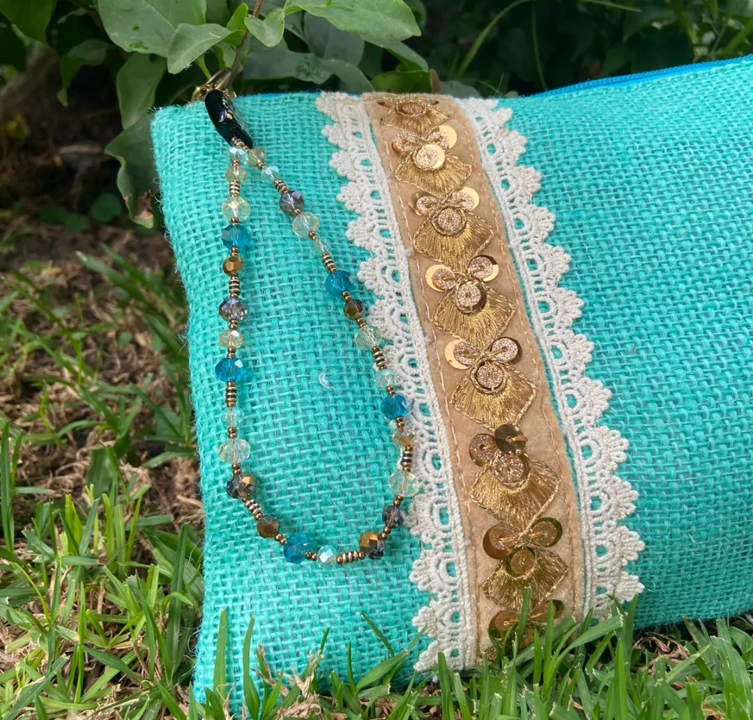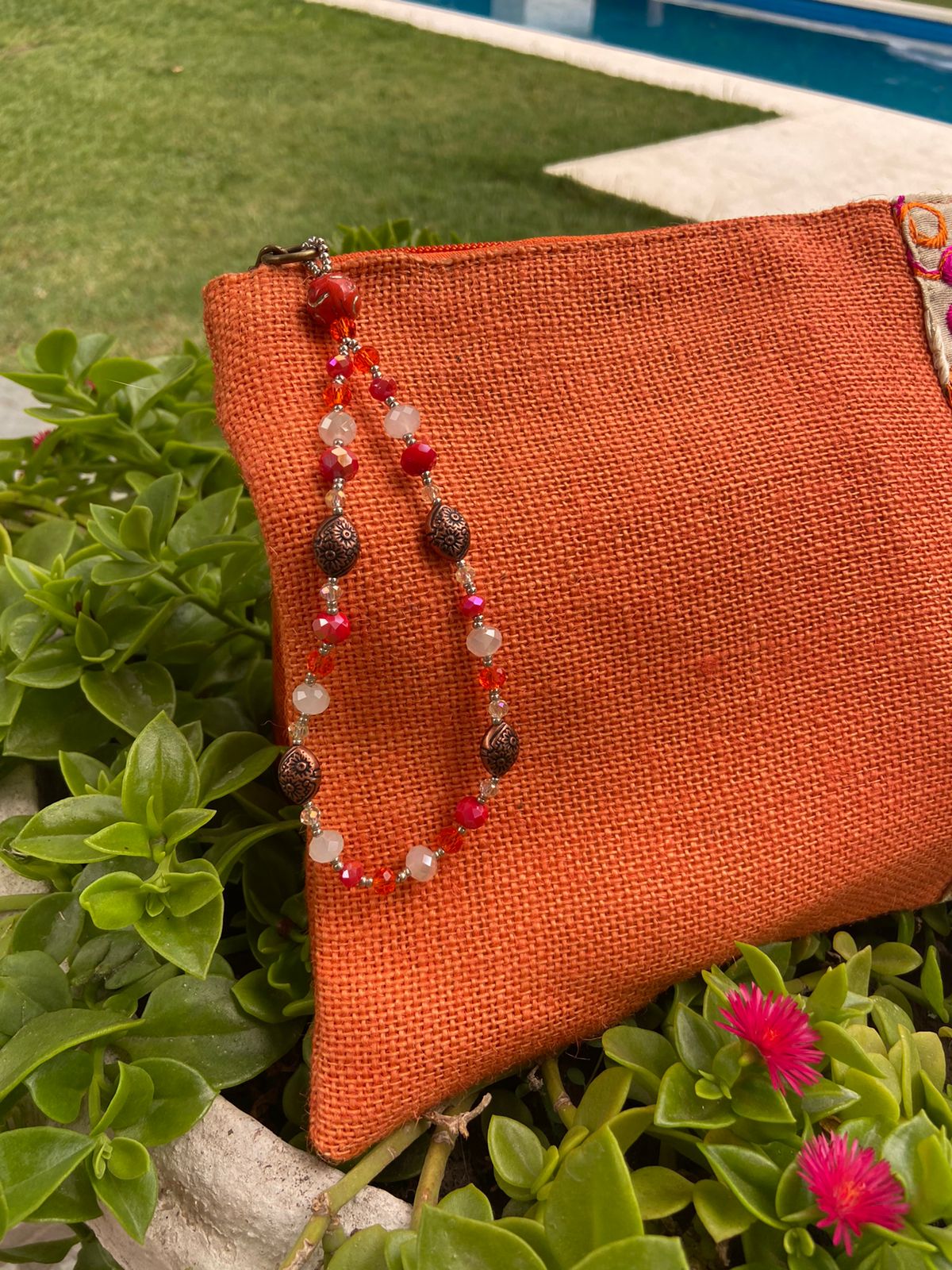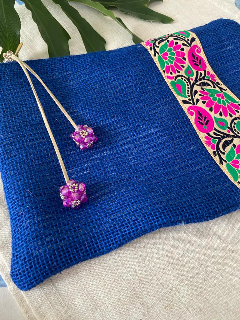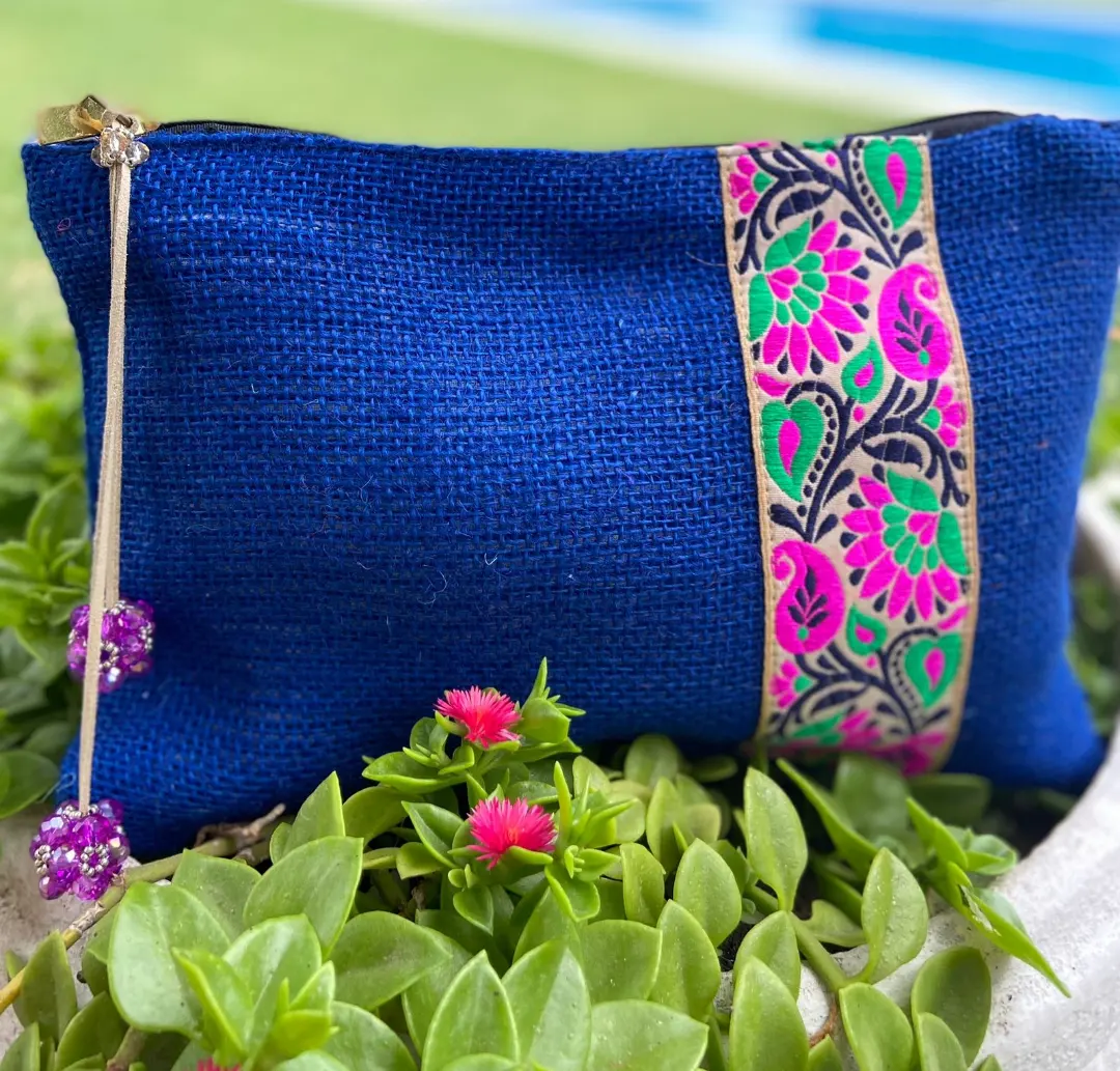 Los sobres realizados en arpillera de distintos colores combinados con galones y telas de la.India. Están forrados por dentro, tienen cierre superior y detalles realizados en cristales y piedras a tono.